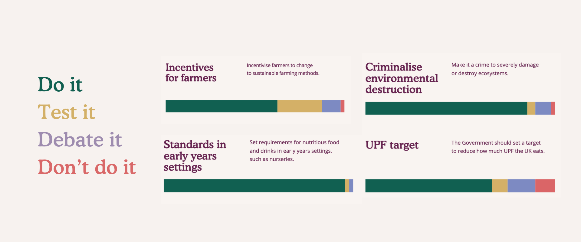 While citizens have deep rooted concerns about the food system, they are inherently solutions-focused in their thinking. The design of The Food Conversation has enabled them to consider many potential ways forward. Throughout the process, citizens have considered a raft of policy solutions that have been proposed previously – from sources such as the National Food Strategy, the United Nations, UKRI funded research, and other charities and NGOs.